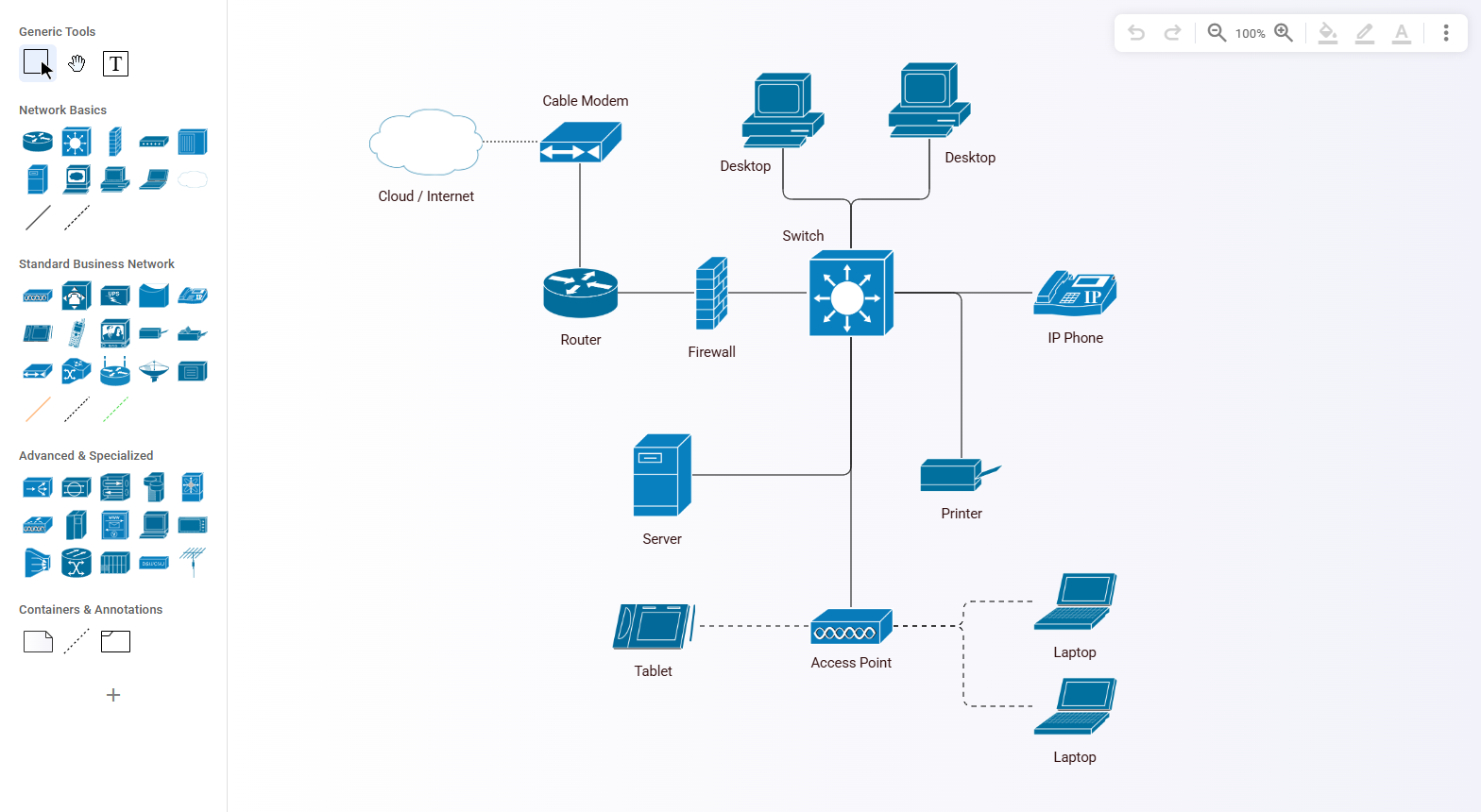 Create professional network topology diagrams with 40+ industry-standard Cisco icons organized across three categories: Network Basics, Standard Business Network, and Advanced Infrastructure. Design both physical and logical network representations with intelligent connection types and color-coded link styling.